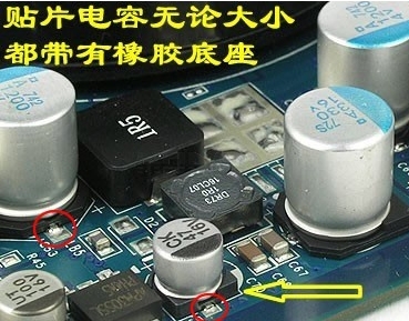 無論是插件式還是貼片式的安裝工藝,電容本身都是直立于PCB板的,根本的區(qū)別方式是SMT(Surface Mount Technology,表面貼裝技術(shù),俗稱貼片工藝)安裝的電容,底部有一層黑色的橡膠底座如圖(圖1):