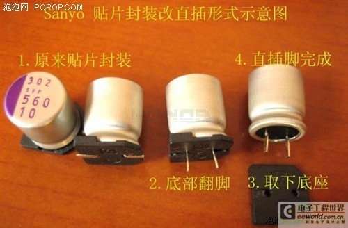 由上圖可以看出,貼片電容也可以改裝成直插電容使用,為什么要改裝呢?這是因?yàn)楹芏郉IY玩家喜歡自己改造主板或者顯卡,直插電容可以用電烙鐵手工焊接,而貼片電容只能使用昂貴的貼片機(jī)進(jìn)行焊接。去掉貼片變成直插解析過程如圖(圖3)
